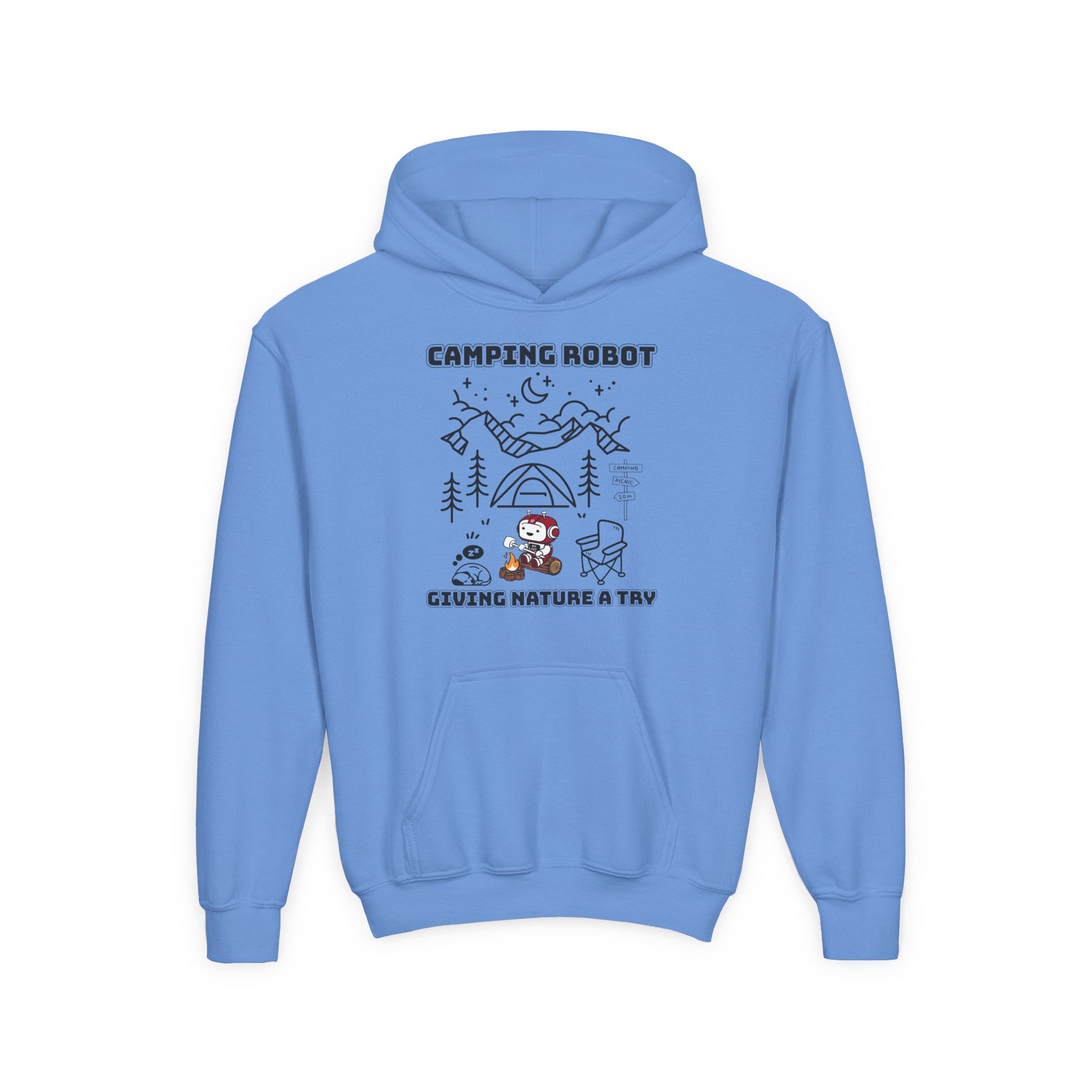 This camping robot youth hoodie gives off a cozy and playful vibe, perfect for little ones who enjoy outdoor adventures. It is ideal for kids who love camping, nature, and robots. This hoodie is great for gifting during birthdays, holidays, and family camping trips.