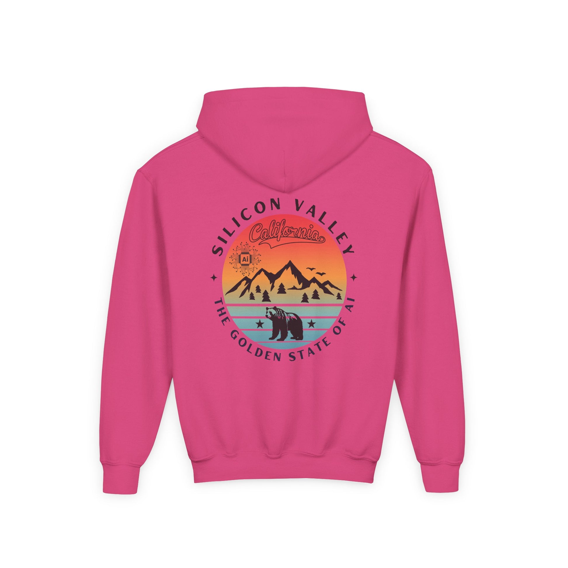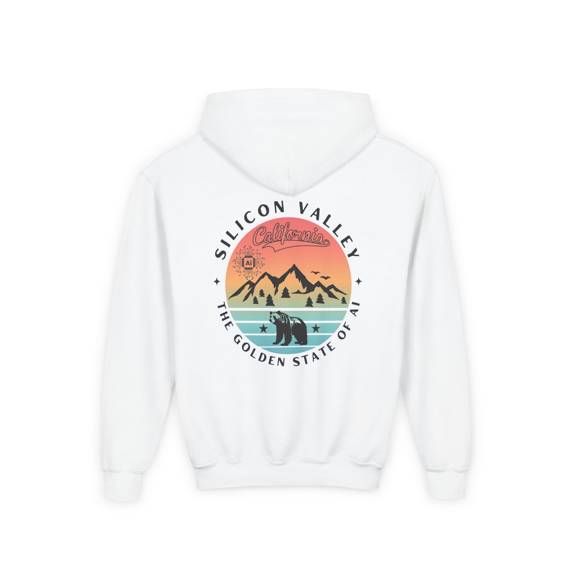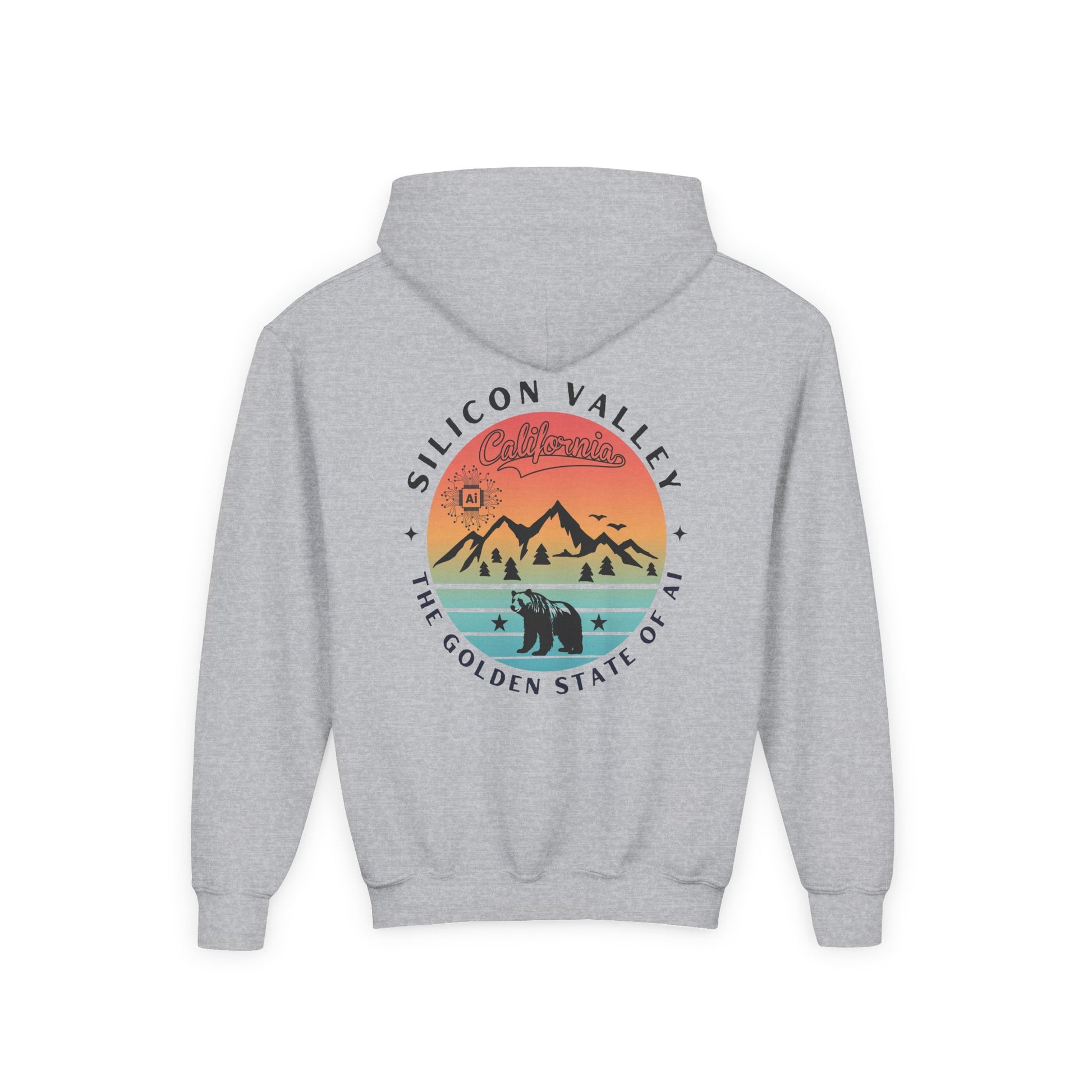 Silicon Valley CA The Golden State of AI designed Youth Hoodie gives a tech-savvy and innovative vibe, perfect for those interested in artificial intelligency and technology. This is a cozy and stylish heavy blend hooded sweatshirt, great for casual wear any day of the year. Perfect for cool days, it offers a comfortable fit and a spirited vibe for young adventurers. Its spacious kangaroo pocket is ideal for keeping hands warm or storing little treasures. Made of a blend of cotton and polyester, it’s durable and perfect for both playtime and relaxation. Ideal for casual outings, school days, or cozy family gatherings, this piece is perfect for gifting. Your kids will love wearing it for birthdays, camping trips, or just hanging out with friends.